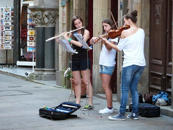 adiante os músicos de rúa interpretan as súas cancións.
